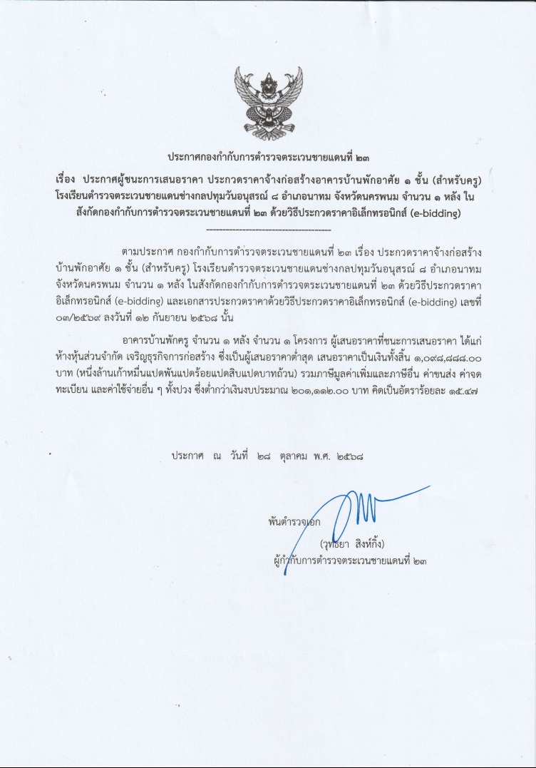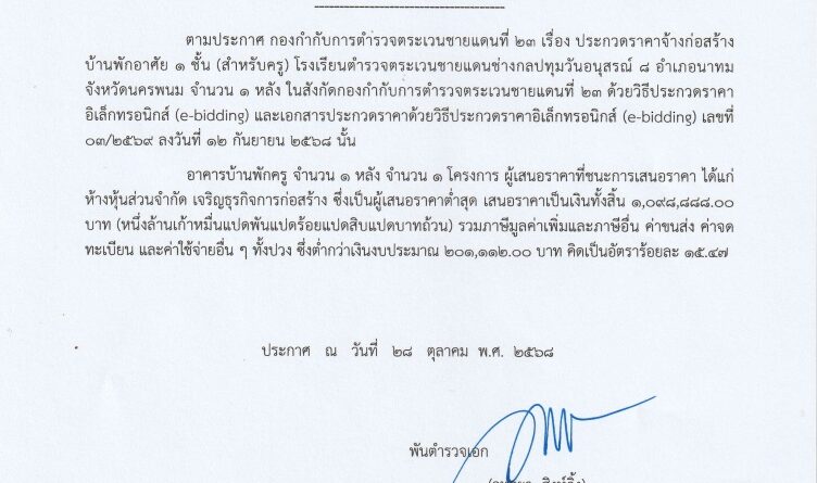 จัดซื้อจัดจ้าง ประกาศผู้ชนะเสนอราคา ประกวดราคาจ้างก่อสร้างอาคารบ้านพักอาศัย 1 ชั้น (สำหรับครู) รร.ตชด.ช่างกลปทุมวันอนุสรณ์ 8 อ.นาทม จ.นครพนม จำนวน 1 หลัง 30 ตุลาคม 2025 administrator รายละเอียด Share.